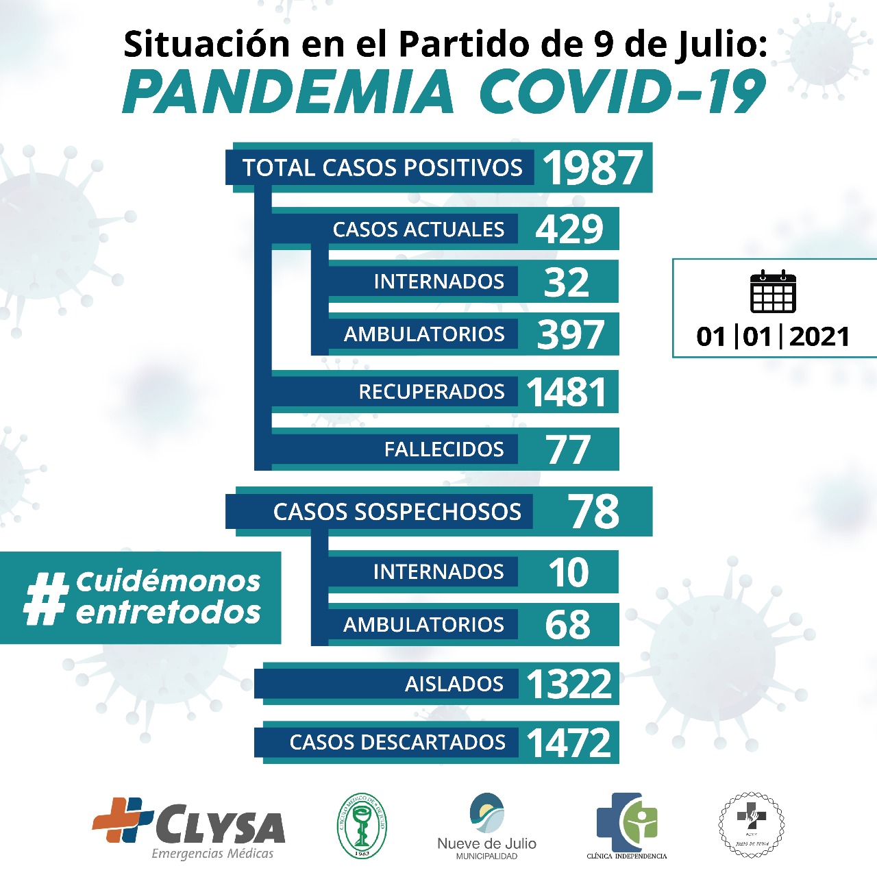Los casos confirmados desde el comienzo de la pandemia son mil novecientos ochenta y siete (1987) de los cuales cuatrocientos veintinueve (429) están activos, setenta y siete (77) fallecieron y mil cuatrocientos ochenta y uno (1481) ya se encuentran recuperados, en tanto se han descartado mil cuatrocientos setenta y dos (1472).