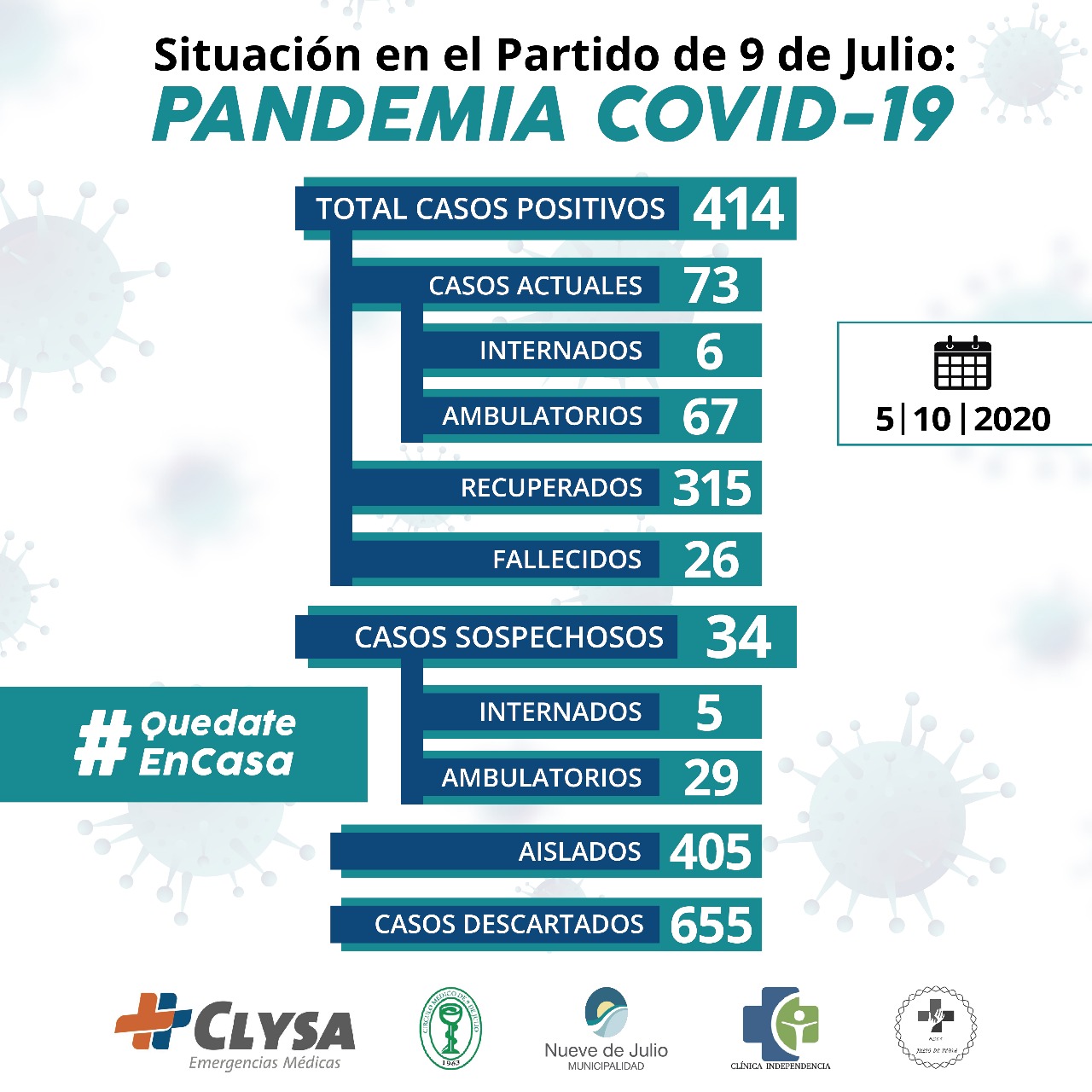 Los casos confirmados desde el comienzo de la pandemia son cuatrocientos catorce (414) de los cuales setenta y tres (73) están activos, veintiséis (26) fallecieron y trecientos quince (315) ya se encuentran recuperados, en tanto se han descartado seiscientos cincuenta y cinco (655).