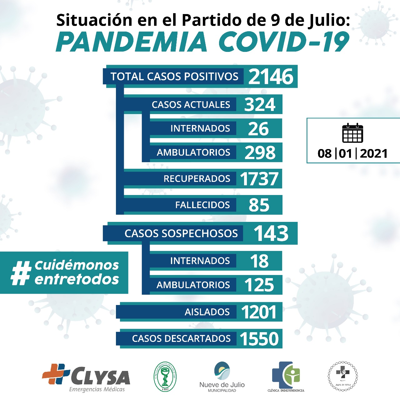 Los casos confirmados desde el comienzo de la pandemia son dos mil ciento cuarenta y seis (2146) de los cuales trescientos veinticuatro (324) están activos, ochenta y cinco (85) fallecieron y mil setecientos treinta y siete (1737) ya se encuentran recuperados, en tanto se han descartado mil quinientos cincuenta (1550).
