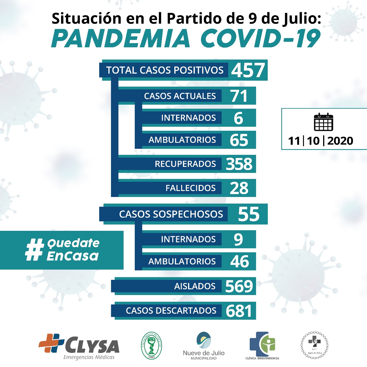 Los casos confirmados desde el comienzo de la pandemia son cuatrocientos cincuenta y siete (457) de los cuales setenta y uno (71) están activos, veintiocho (28) fallecieron y trecientos cincuenta y ocho (358) ya se encuentran recuperados, en tanto se han descartado seiscientos ochenta y uno (681).