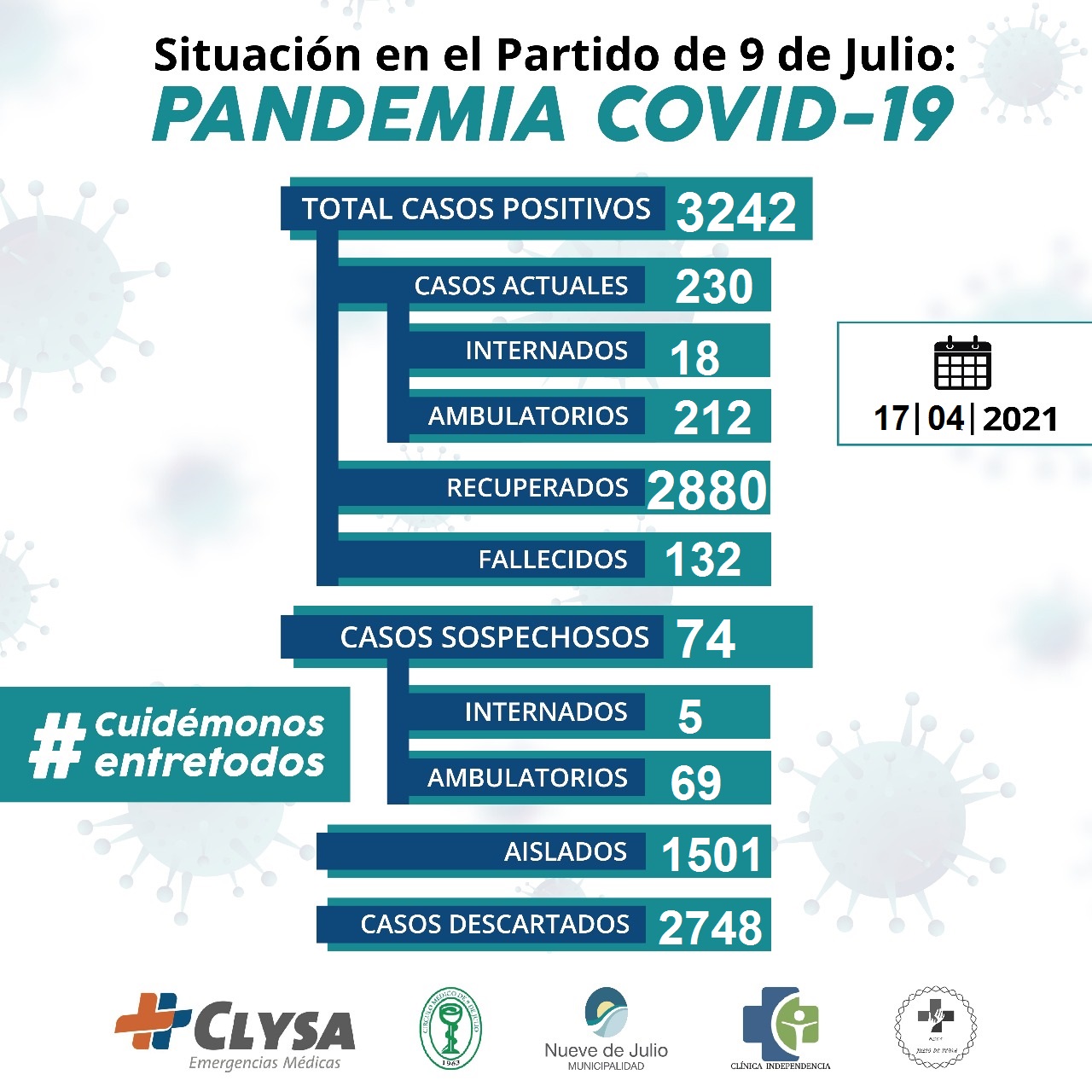 Es importante informar que recibieron el alta nueve (9) pacientes, y de los doscientos treinta (230) que cursan la enfermedad Covid-19, dieciocho (18) se encuentran internados y el resto de los casos activos, un total de 212, se encuentran cursando la enfermedad en forma ambulatoria.