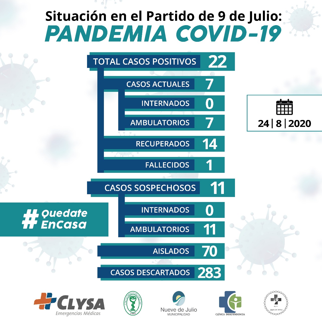 Los casos confirmados desde el comienzo de la pandemia son veintidós (22) de los cuales siete (7) están activos, uno (1) falleció y catorce (14) ya se encuentran recuperados, en tanto se han descartado doscientos ochenta y tres (283).