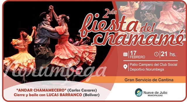 Con el auspicio de la Municipalidad de Nueve de Julio, en el patio campero del Club Social y Deportivo Norumbega, tendrá lugar el sábado 17 de febrero, desde las 21 hs. la 2da. Fiesta del Chamamé de esta localidad, la que contará con las presentaciones de “Andar Chamamecero” (Carlos Casares) y un gran cierre bailable animado por Lucas Barranco (Bolívar).