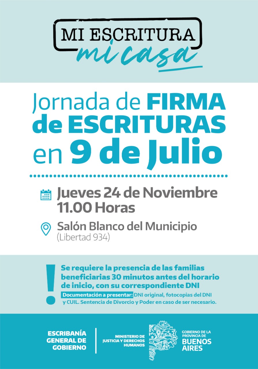 La jornada de escrituración se realizará el jueves 24 de noviembre, a partir de las 11 horas, en el Salón Blanco del Municipio, donde las familias beneficiarias deberán asistir con DNI, fotocopia del DNI y CUIL, sentencia de divorcio y poder (en caso de ser necesario).