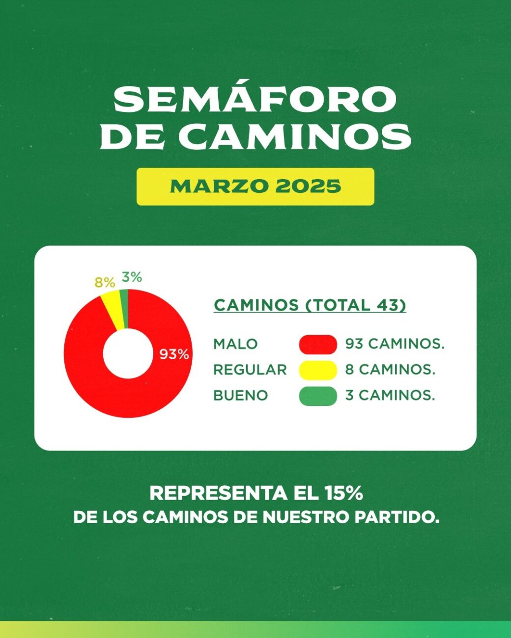 En este nuevo informe, donde se relevaron 43 caminos, y que representa a unos 700 kms. rurales, ello es el 15% de la red vial rural de 9 de Julio, compuesta por 290 caminos, y en esta oportunidad solo un camino resulto en buen estado (verde).
