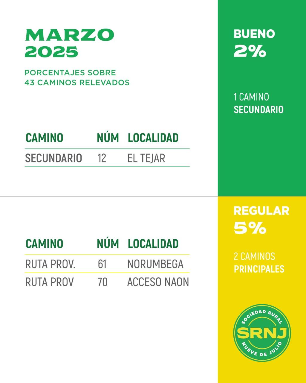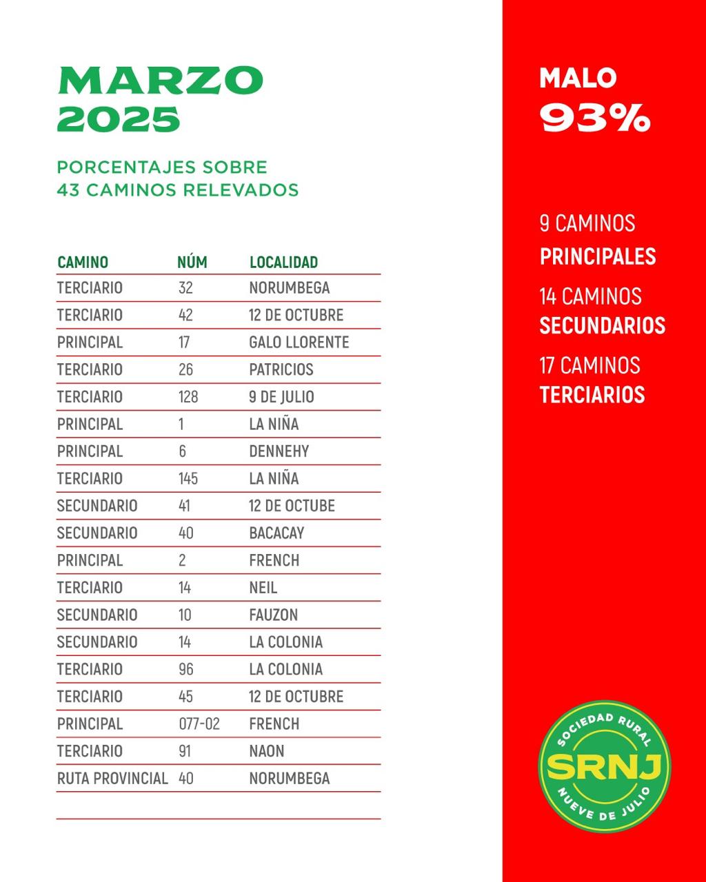 Sociedad Rural de 9 de Julio público el informe del Semáforo de Caminos Rurales del Distrito correspondiente al mes de marzo.