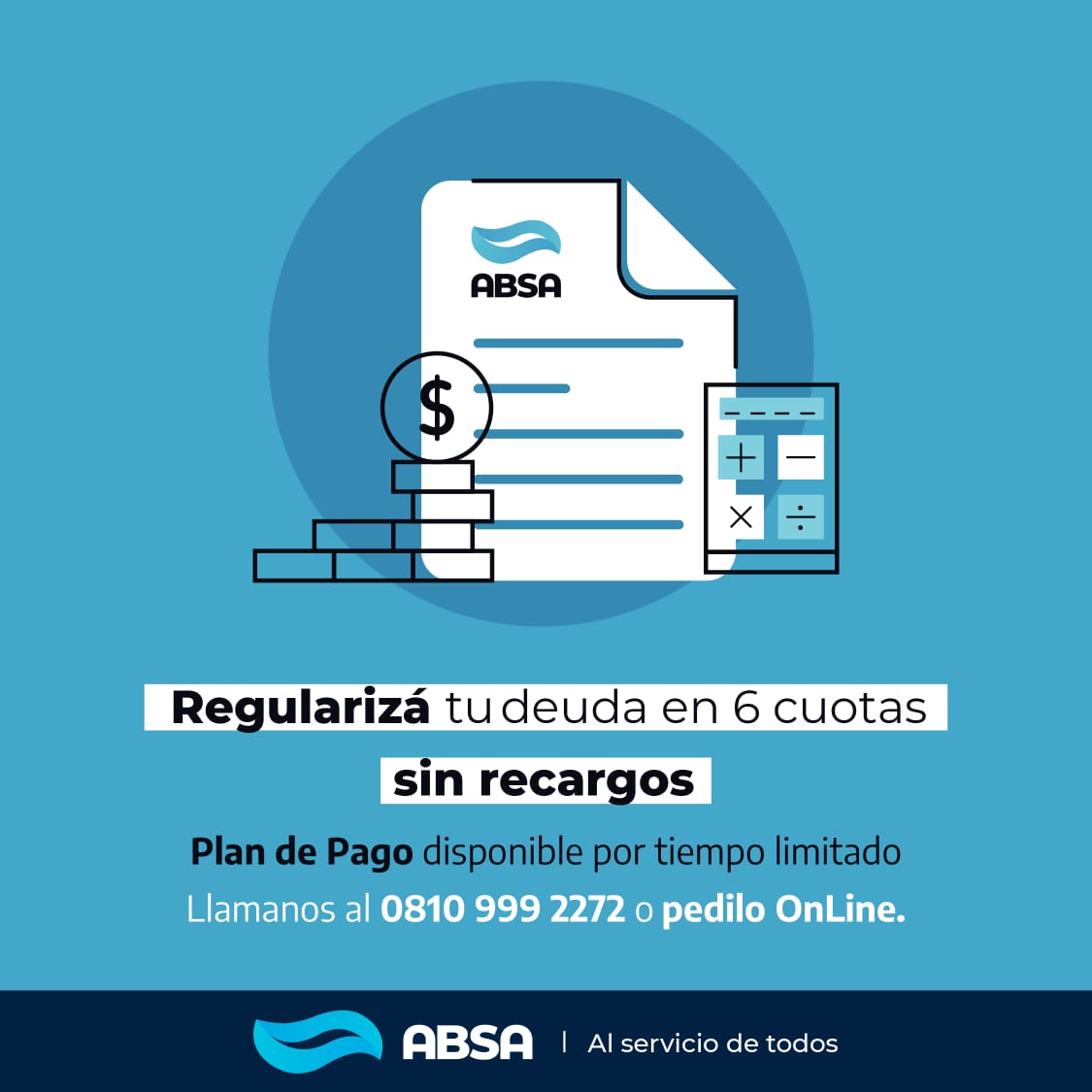 ABSA informa que continúan disponibles los beneficios del plan de pagos para aquellos usuarios que deban facturas emitidas por la prestadora. De este modo, hasta el 31 de enero del 2022 se podrá financiar esa deuda hasta en 6 cuotas sin recargos, ni intereses.