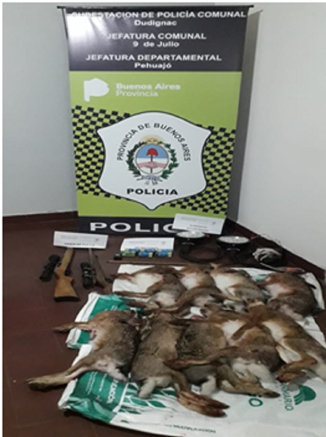 En el día de la fecha en horas de la madrugada la Sub Estación de Policía Dudignac recibe un llamado telefónico dando cuenta que en zona rural de ese medio habría personas armadas casando, se comisiona personal Policial al lugar y constata que efectivamente, personal de ese elemento procede a la aprehensión de tres sujetos quien resultan ser MOREYRA ALEJANDRO, BUSINZKA JONATAN y VALLE DANIEL, todos ellos oriundos de la localidad de Henderson. En su poder llevaban dos carabinas calibre 22 con numeración suprimida, cartuchos calibre 22 y diez liebres. Se instruye IPP caratulada TENENCIA ILEGAL DE ARMA DE FUEGO, ENCUBRIMIENTO DE SUPRESION DE UN OBJETO REGISTRABLE, con injerencia de la UFI Nro. 6 del Departamento Judicial Mercedes. Los tres aprehendidos quedan alojados en esa localidad a los fines de ser trasladados el día05 del corriente mes y año a sede tribunalicia.-