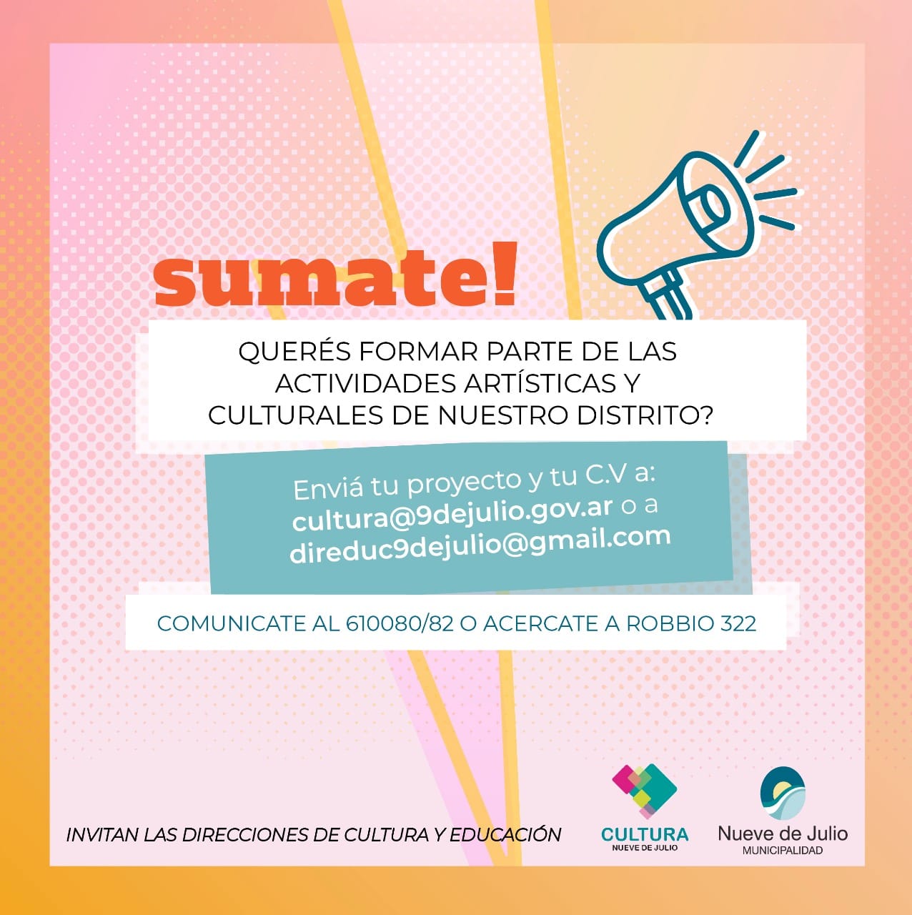 La Municipalidad de Nueve de Julio, a través de las direcciones de Cultura y Educación, se encuentra lanzando una convocatoria abierta a todos los interesados en sumarse para formar parte de las actividades artísticas y culturales de nuestro distrito.