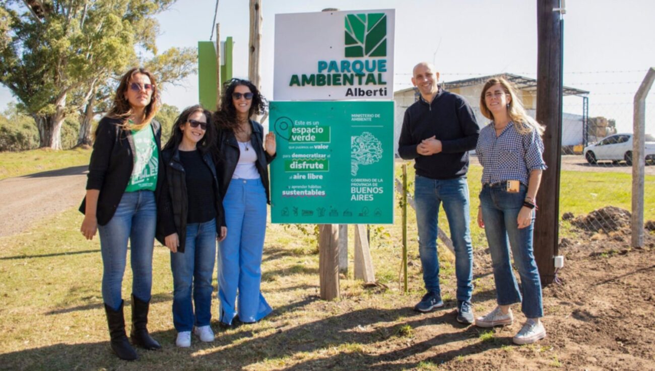El intendente de Alberti, Germán Lago, junto a la subsecretaria de Política Ambiental Tamara Basteiro y Julieta Martín, coordinadora de la Unidad Provincial de Consejos Regionales del ministerio de Ambiente de la Provincia de Buenos Aires realizaron el corte de cintas junto a alumnas y alumnos de establecimientos educativos del distrito.