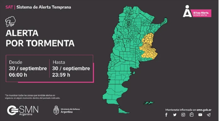 Tras un fin de semana cálido y mayormente soleado, rige en gran parte del territorio bonaerense una alerta amarilla por tormentas, que se extiende hacia las localidades del Área Metropolitana de Buenos Aires (AMBA) y a las regiones del norte, centro, este y sur de la provincia, según informó el Servicio Meteorológico Nacional (SMN).