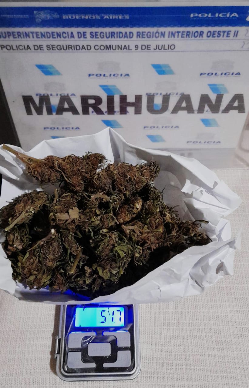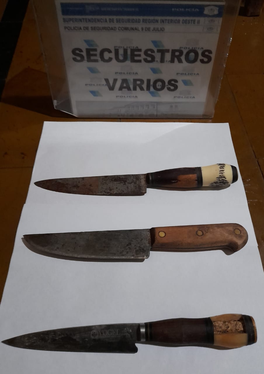 Policía Comunal informa que ayer en horas de la tarde y a raíz de una orden de allanamiento dispuesta por el Juzgado de Garantías número 2 del Departamento Judicial de Mercedes, personal de la Estación de Policía Comunal de 9 de Julio juntamente con personal del Puesto de Vigilancia de Patricios y SUB DDI 9 de Julio, se constituyen a la Localidad de Patricios, donde en calles Alberti s/n entre Sarmiento y Avellaneda se procede al secuestro de tres cuchillos y 51,7 gramos de marihuana. Citado allanamiento  guarda relación al hecho caratulado como Amenazas Agravadas y Lesiones Leves donde un masculino de 24 años en el mes de Mayo del corriente año denuncia en esta seccional que había sido golpeado y amenazado de muerte con cuchillos por un sujeto de 25 años quien se domicilia en el domicilio allanado y al momento de la diligencia judicial no se encontraba presente, guardando relación los cuchillos secuestrados como los mismos que el imputado utilizara en el hecho.