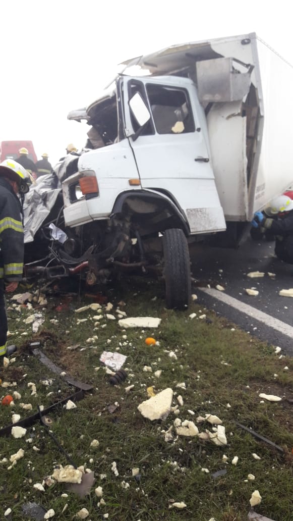 Parte policial: Se lleva a conocimiento que en el día de la fecha siendo alrededor de las 08.00  horas se iniciaron actuaciones caratuladas  «HOMICIDIO CULPOSO  Y LESIONES CULPOSAS»  donde en  Ruta Nacional 5 km 276 esta  se  constata que momentos antes por, motivos a establecer, la colisión entre  camión térmico Mercedes pte. SUM 338, conducido por   SANTIAGO EDUARDO  CAMOU  de 47 años   y como acompañante RAUL BASUALDO de 38 años de edad ambos con domicilio en esta localidad  y camión SCANIA 113 dominio TAC648 con acoplado pte.  WVI668,  conducido por  GASTON DAMIAN ARO  de 32 años con domicilio en Trenque Lauquen,  dicho camión cargado de pales.