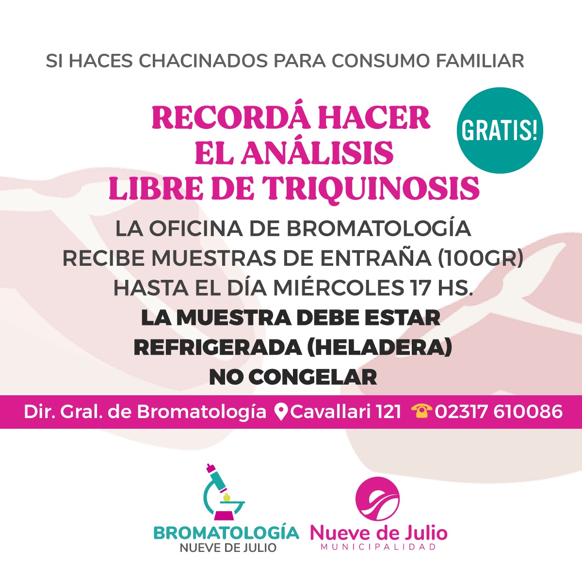 La Dirección de Bromatología de la Municipalidad de Nueve de Julio recuerda a los vecinos que realicen chacinados para consumo familiar, que deben realizar el análisis de triquinosis, que se efectúa de manera totalmente gratuita.
