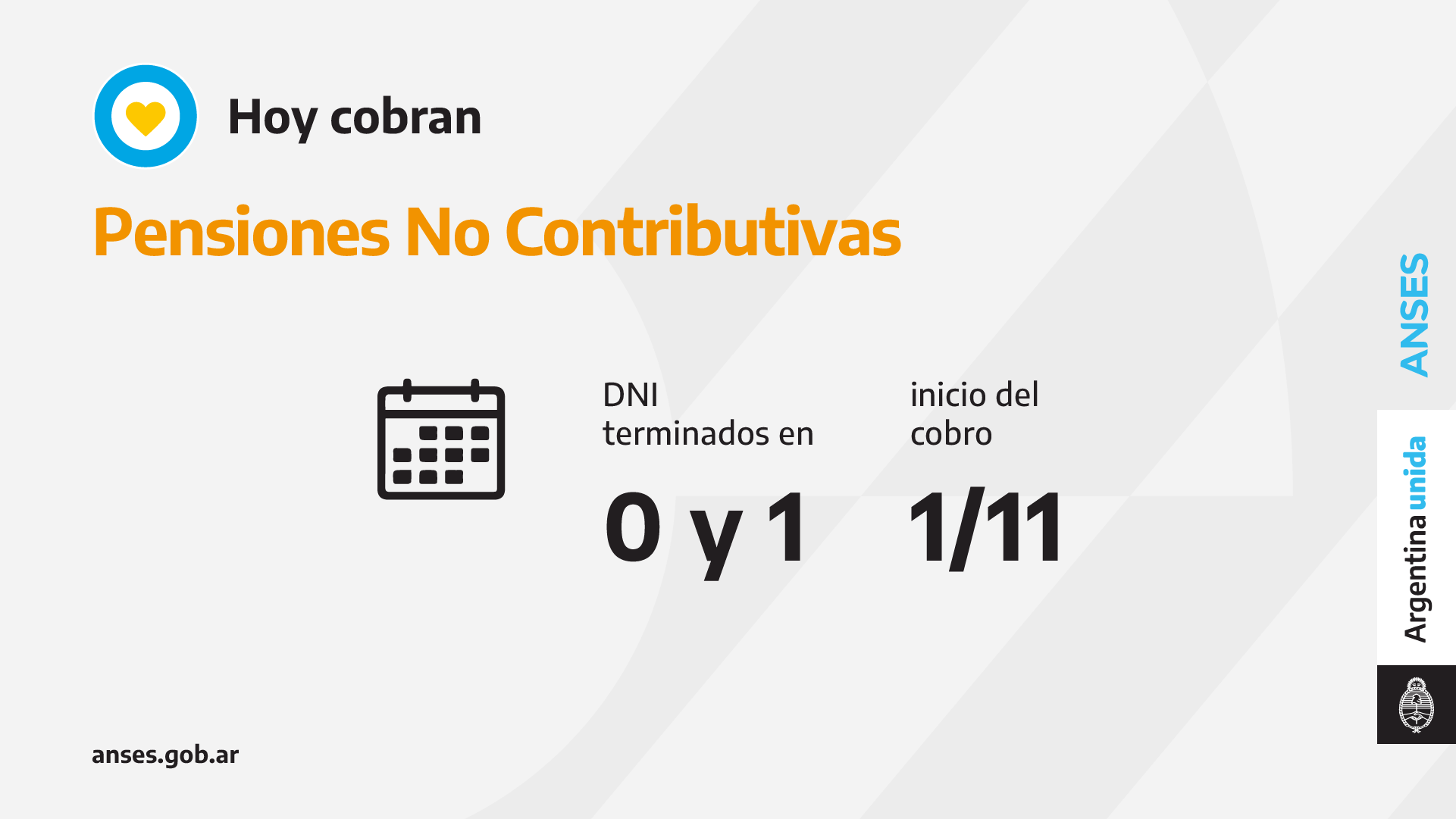 En el marco del Plan Argentina contra el Hambre del Ministerio de Desarrollo Social, ANSES acompaña con el pago del programa Alimentar. Hoy cobran Madres de 7 hijos que perciben PNC con documentos finalizados en 0 y 1, no poseen la tarjeta plástica y reciben el dinero en la misma cuenta de la prestación.