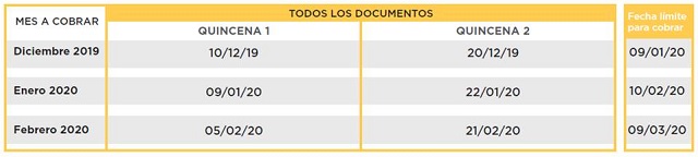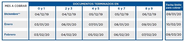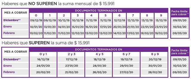 | En la pantalla principal del sitio web www.anses.gob.ar, sección Accesos rápidos, opción Calendario de Pagos, ANSES publica el cronograma de cobro correspondiente a los meses de diciembre de 2019 y enero y febrero de 2020. En este marco, los beneficiarios de jubilaciones, pensiones, Pensiones No Contributivas, Asignación Universal por Hijo y por Embarazo, Prestación por Desempleo y Asignaciones Familiares y de Pago Único (Matrimonio, Nacimiento y Adopción) tienen la posibilidad de agendar las fechas y tenerlas a mano para una consulta anticipada y más rápida. Además, los calendarios están disponibles en sus redes sociales: Facebook (www.facebook.com/ansesgob), Twitter (@ansesgob) y Flickr (www.flickr.com/photos/ansesgob). *Todos los grupos de pago tienen tiempo para cobrar sus haberes hasta la fecha límite correspondiente. ** Diciembre 2019 incluye la segunda cuota del aguinaldo
