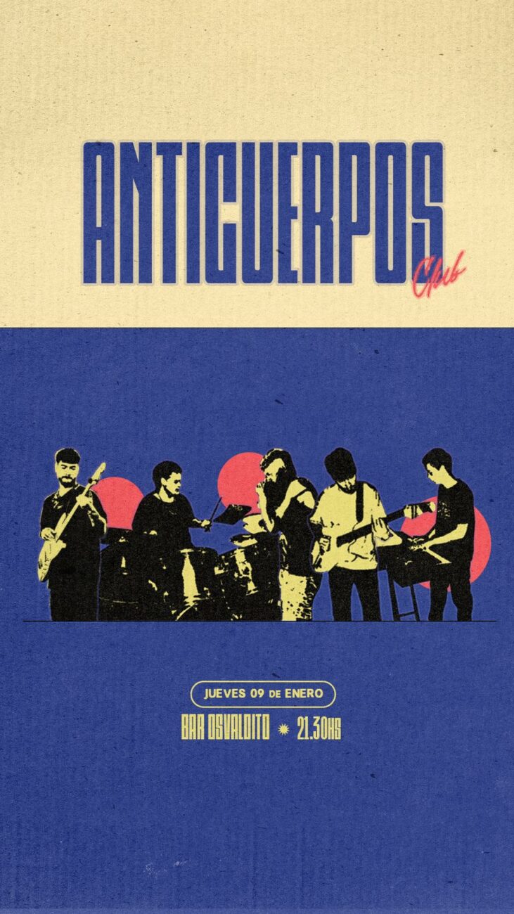 Dueños de un estilo muy particular que transita por el rock, el funk y lo experimental, son una excelente propuesta musical. Liderados por Sebastián Paniagua en guitarras y voz, Anticuerpos Club se completa con Joaquín Dominguez en bajo, Santiago Piazza en teclados, «Jota» en armónica y «Molzi» en la batería. Talentosísimos jovenes locales con una exquisita propuesta de rock gourmet.