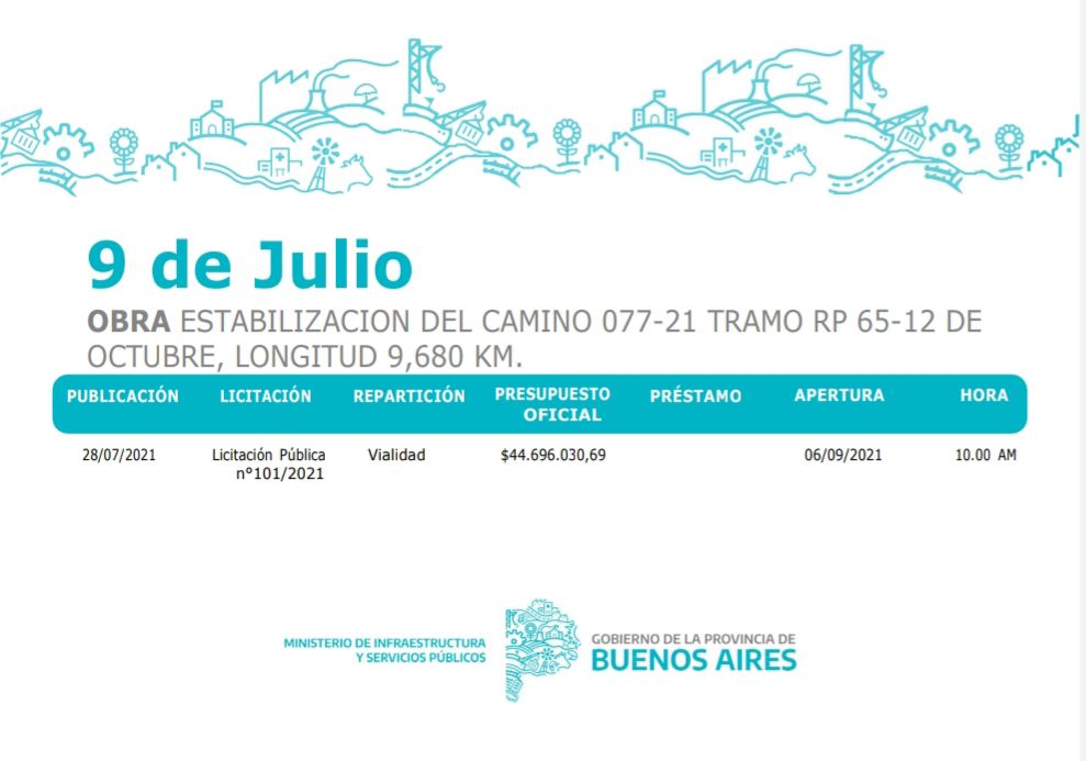 El Ministerio de Infraestructura bonaerense anunció la realización de la obra para mejorar el estado del camino que conecta la ruta provincial N65 con la localidad de 12 de octubre, en el partido de 9 de Julio. La misma, significa una inversión de $44.696.030,69 para el gobierno provincial.