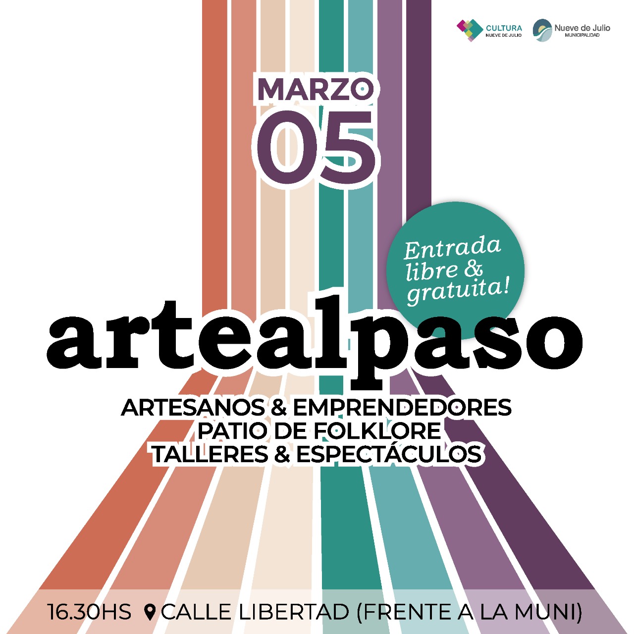 La Dirección de Cultura de la Municipalidad de Nueve de Julio continuará desarrollando la edición 2023 de “Arte al Paso”, con el segundo encuentro a realizarse el domingo 5 de marzo, desde las 16,30 hs., en calle Libertad entre Avdas. Mitre y San Martín, frente al Palacio Municipal.