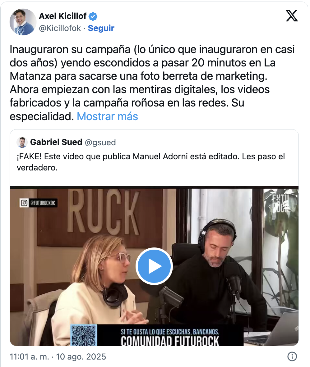 Kicillof desmintió un video que había publicado el vocero presidencial, Manuel Adorni, en el que se lo veía decir que “no tenía propuestas” para el peronismo. El registro correspondía a una entrevista en Futurock, pero había sido recortado y editado para alterar el sentido de sus declaraciones.
