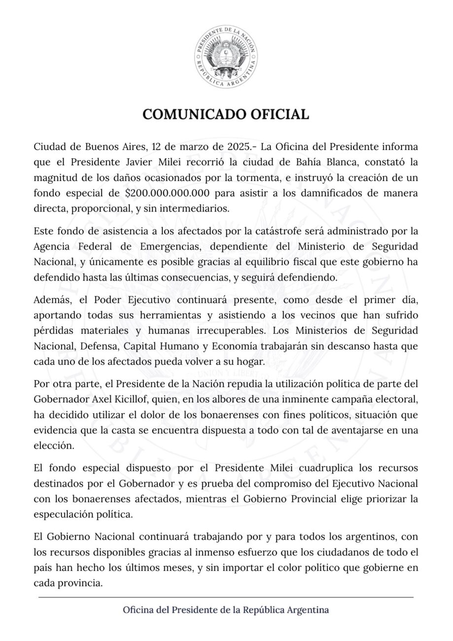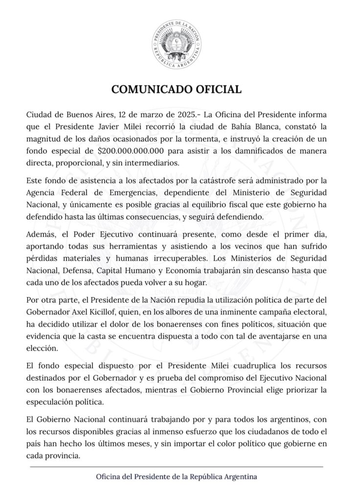 A través del comunicado difundido por la Oficina del Presidente en X, se indicó que Javier Milei “repudia la utilización política de parte del gobernador Axel Kicillof” y apuntaron que “en los albores de una inminente campaña electoral, ha decidido utilizar el dolor de los bonaerenses con fines políticos”.