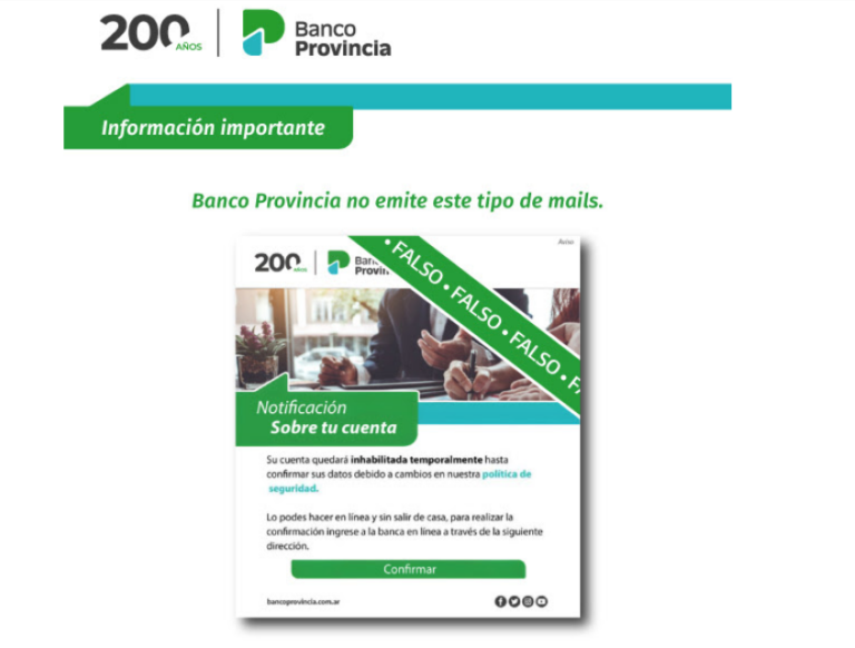 El Banco Provincia advirtió a sus clientes sobre correos electrónicos falsos que se están enviando desde mails o perfiles de redes sociales que no son de la entidad financiera, donde se notifica de una supuesta inhabilitación temporaria de las cuentas bancarias por cambios en la política de seguridad del organismo.