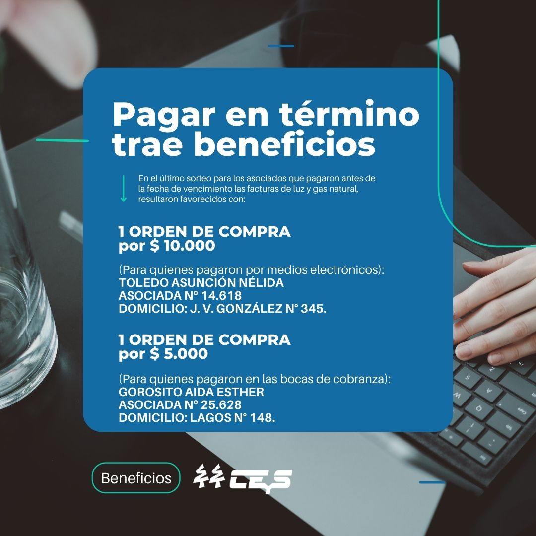 En el último sorteo para los asociados que pagaron antes de la fecha de vencimiento las facturas de luz y gas natural, resultaron favorecidos con: