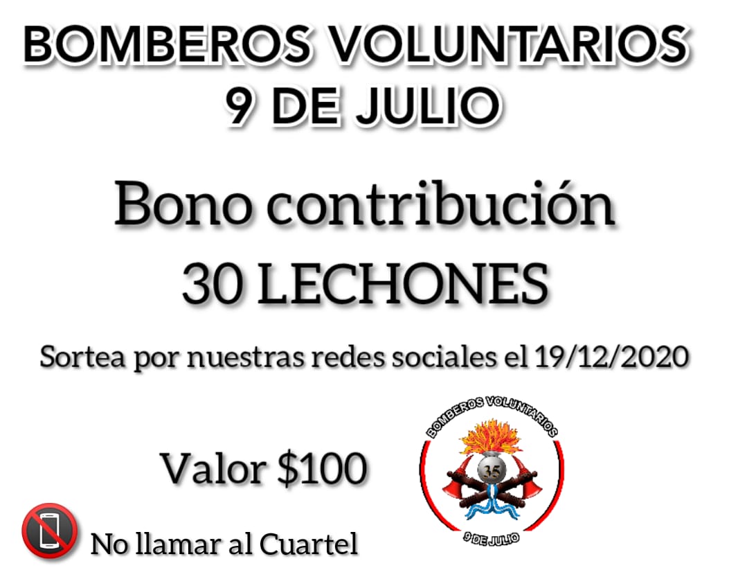 La comisión directiva comunica a toda la comunidad que se realizará el sorteo de «LOS 30 LECHONES DE BOMBEROS VOLUNTARIOS 9 DE JULIO».