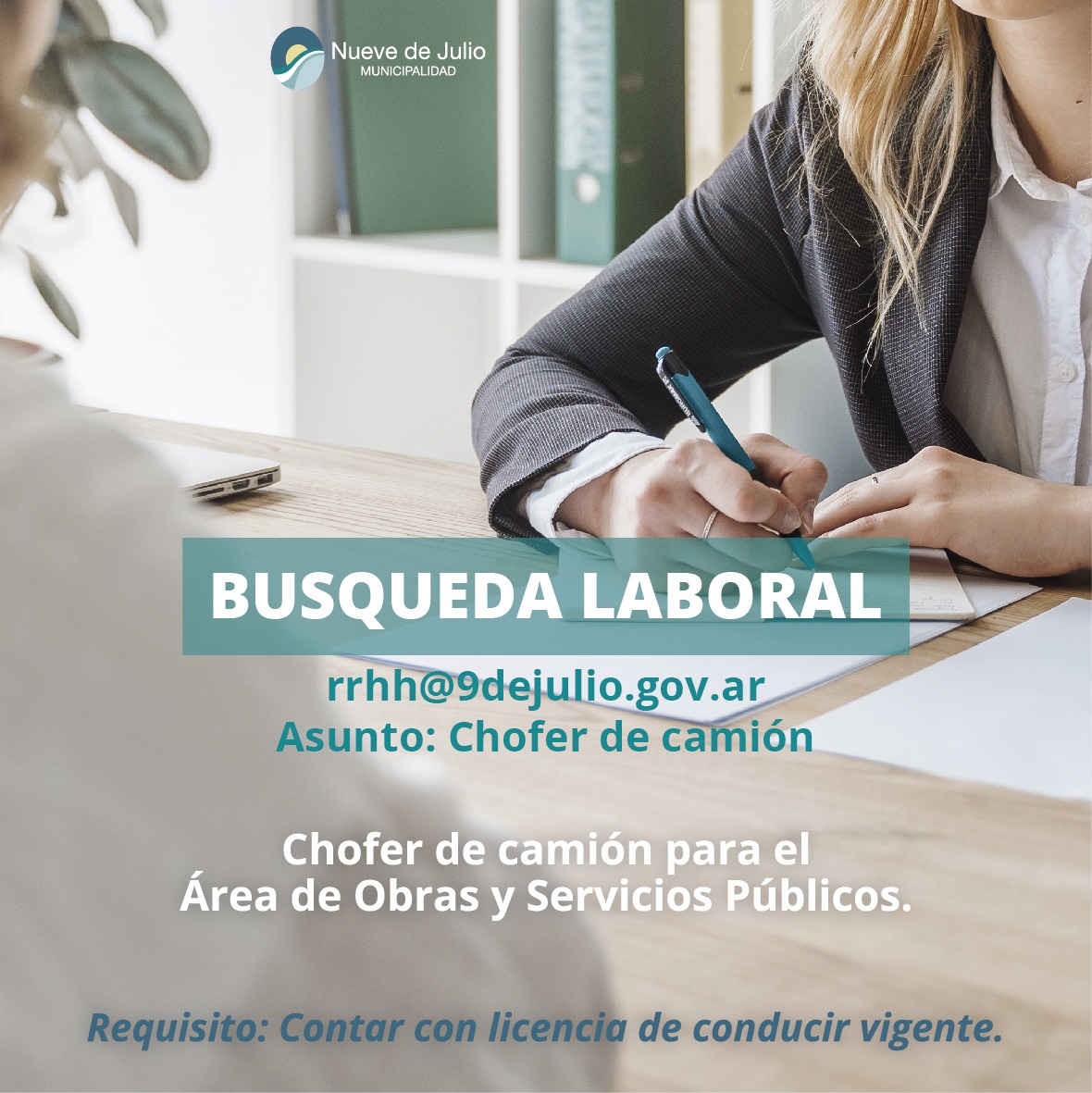 La Dirección General de Recursos Humanos de la Municipalidad de Nueve de Julio se encuentra desarrollando una búsqueda laboral de chofer de camión, para el área de Obras y Servicios Públicos.