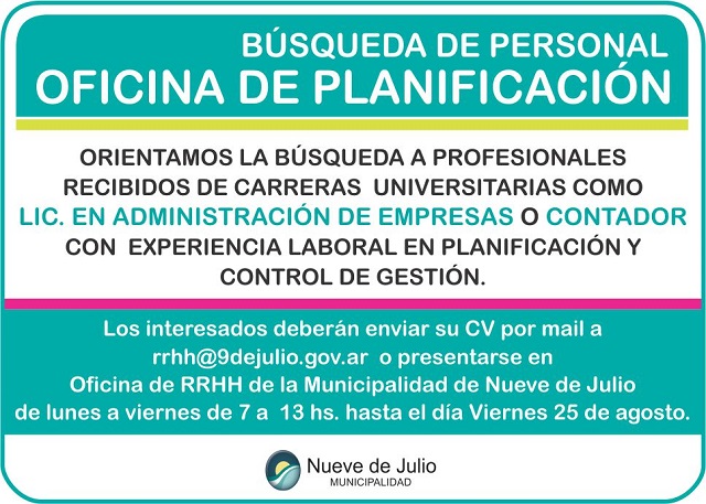 La Municipalidad de Nueve de Julio, a través de la Dirección de Recursos Humanos se encuentra realizando una búsqueda laboral orientada hacia la Oficina de Planificación.