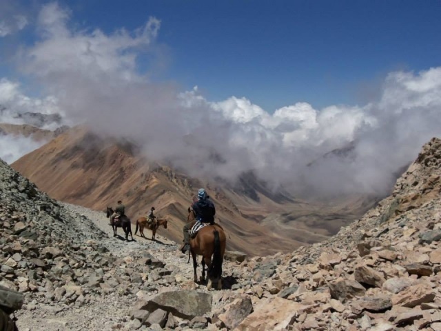 DDG- Salimos de la ciudad de Mendoza, hacia una bodega con visita y degustación. De ahí partimos hasta los tres mil metros donde esperan los caballos, los arrieros y baqueanos, y ahí nos quedamos. Al otro día temprano, 8:30 aproximadamente, ensillamos y cruzamos el primer cordón montañoso por el paso El Portillo, a 4200 metros de altura y llegamos al valle donde nos quedamos. El día siguiente es de descanso, con una salida corta como para que no se desacostumbre la gente. Al otro día nos vamos hasta el límite con Chile y volvemos al mismo refugio. Al día siguiente, hacemos una salida hacia el mesón San Juan, un cerro increíble, lleno de tropillas de guanacos y volvemos al refugio. Al día siguiente emprendemos el regreso hasta los 3000 metros donde nos espera la combi para regresar a la ciudad de Mendoza. Son 6 días completos en la cordillera”.