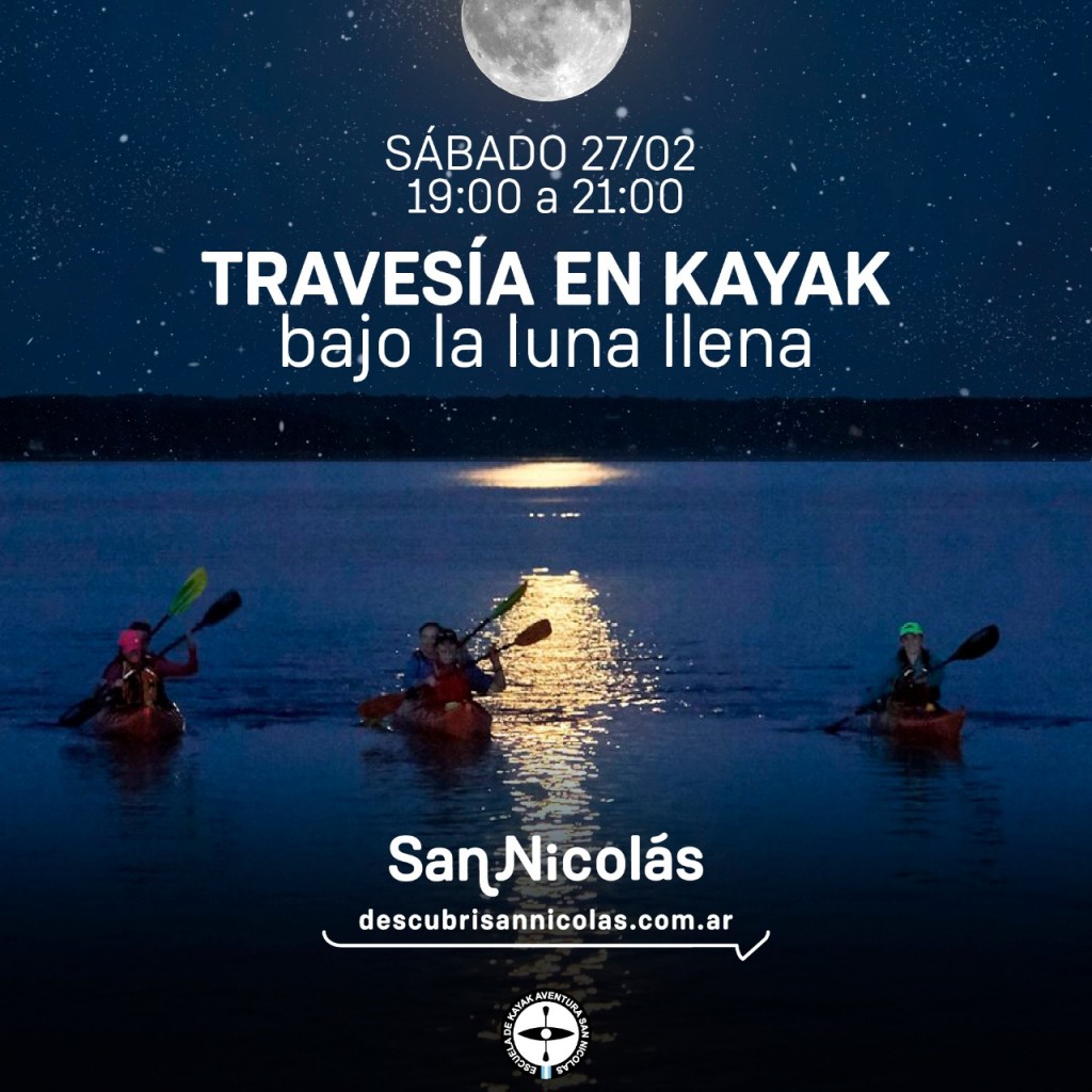 Descripción: Travesía en kayak bajo la luz de la luna llena hacia la laguna El Saco. Será obligatorio el uso de barbijo en espacios comunes y, al navegar, el chaleco salvavidas, linterna y silbato. Actividad gratuita con inscripciones al (3364) 672938. Cupos limitados de 100 embarcaciones. Organiza: Municipalidad de San Nicolás con colaboración de Prefectura Naval Argentina, Escuela de Kayak Aventura y Club de Regatas San Nicolás.