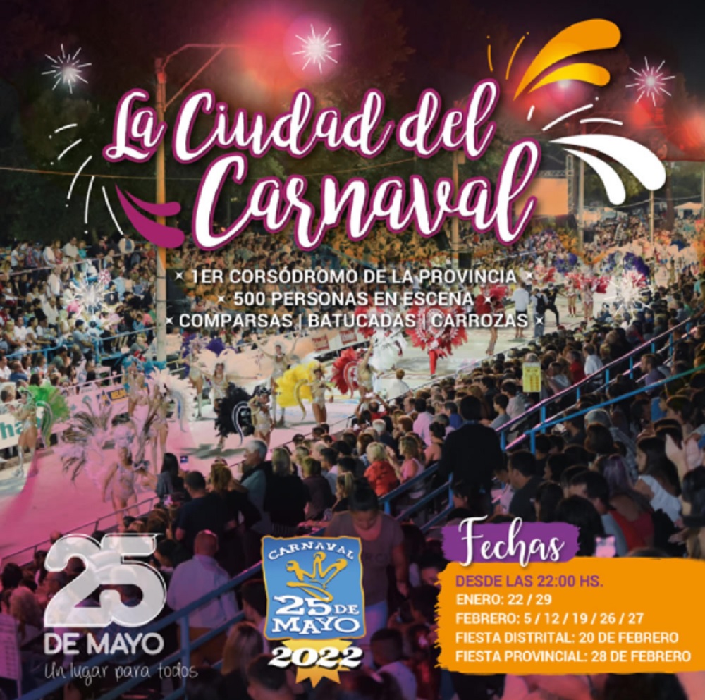 Descripción: Todos los sábados de febrero desfilarán comparsas, batucadas y carrozas. Además reconocidos artistas se presentarán con espectáculos en vivo, que tienen entrada arancelada. Organiza la Comisión Institucional de Fiestas Populares en conjunto con la Municipalidad de 25 de Mayo y el apoyo del Gobierno de la provincia de Buenos Aires