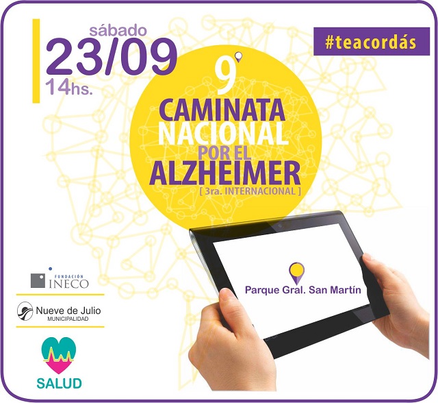 El sábado 23 del corriente, desde las 14 hs., en el Parque Gral. San Martín, se desarrollará en nuestra ciudad la 9 na. Caminata (3 era. de carácter Internacional) por el Alzheimer, una iniciativa de la Fundación INECO, organización sin fines de lucro que promueve la investigación científica en neurociencias; la formación académica de profesionales; y la educación y concientización en la comunidad acerca del funcionamiento cerebral y las enfermedades neurológicas y psiquiátricas, y que desarrolla estas actividades con motivo del Día Mundial de esa patología, que se conmemora cada 21 de septiembre.