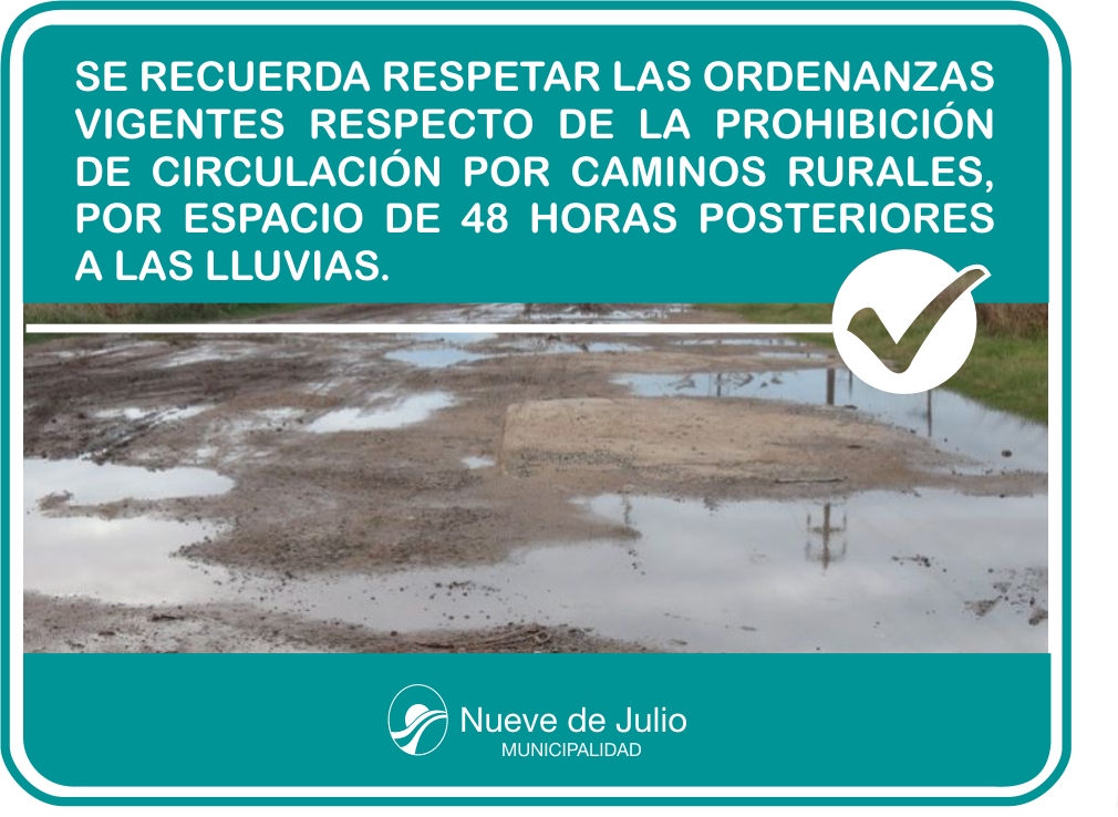 La Municipalidad de Nueve de Julio, a través de la Secretaría de Obras y Servicios Públicos, solicita a productores agropecuarios, acopiadores, transportistas y vecinos en general, recordar y respetar las ordenanzas vigentes respecto de la prohibición de circulación por caminos rurales con cargas, por espacio de 48 horas posteriores a las lluvias, así como la cumplimentación de las disposiciones vigentes respecto de la capacidad de cargas.