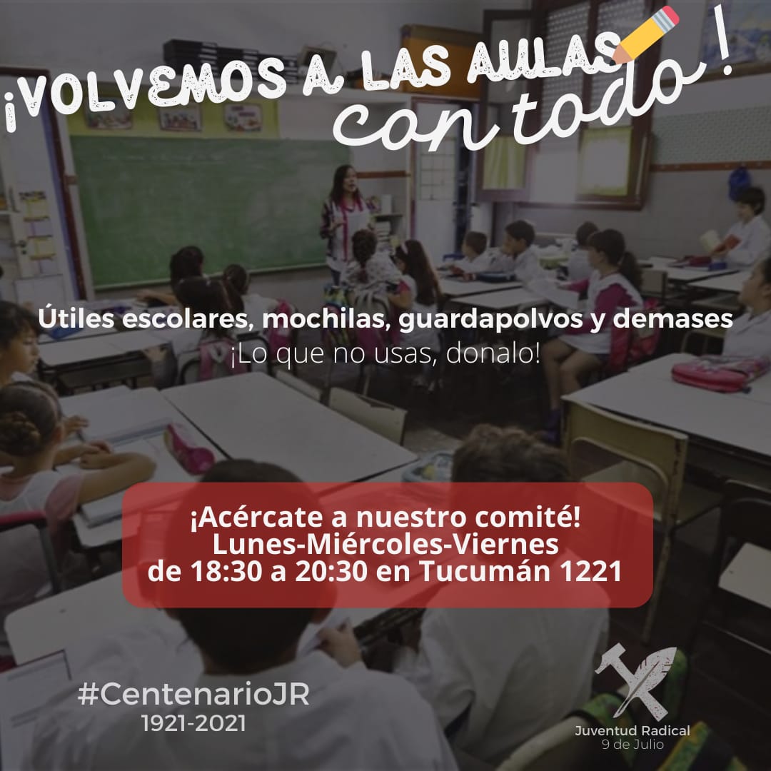 La Juventud Radical lanza la tradicional campaña solidaria de vuelta al cole como todos los años con la consigna «Volvemos a las aulas con todo»Estarán recibiendo donaciones, útiles escolares, guardapolvos, mochilas y demás, en su sede partidaria ubicada en Tucumán 1221.