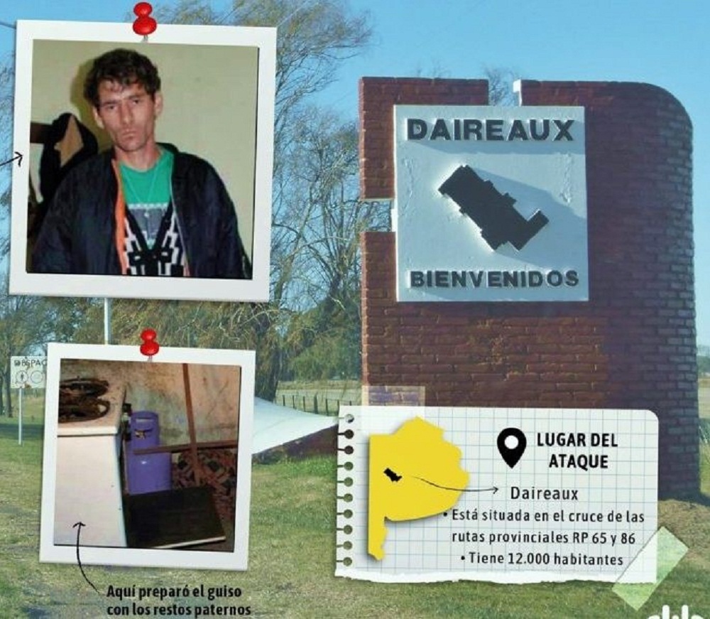 Este hecho ocurrió en la Localidad de Daireaux Provincia de Buenos Aires el 30 de Junio de 2008. “Desde la puerta de la casa paterna, en la localidad bonaerense de Daireaux, después de cometer el homicidio que quedará en los canales de los casos policiales en la Argentina. Raúl Ernesto Piñel, de 33 años, se despidió con el último resto de rencor que todavía le quedaba hacia su padre Raúl Prudencio Piñel de 57 años; con las manos llenas de sangre, sereno-según comentaron los policías que lo detuvieron -, Piñel hijo dejó tras de sí la huella del horror de una noche, la del sábado pasado, en la que asesinó a su padre, lo descuartizó con un cuchillo Tramontina, lo quemó en forma parcial en una salamandra y lo más terrible: le comió parte de sus órganos.”