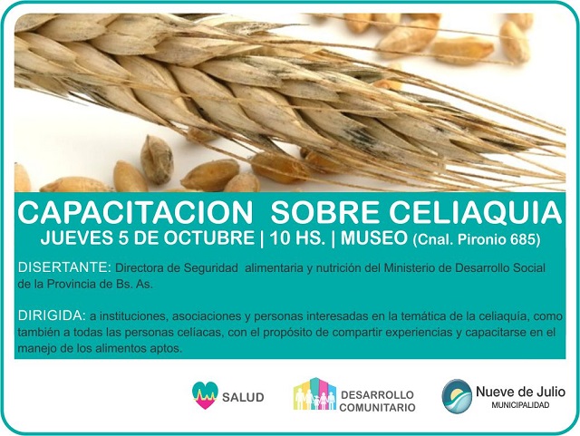 Las Secretarías de Desarrollo Comunitario y de Salud de la Municipalidad de 9 de Julio informan que el próximo jueves 5 de octubre, el Ministerio de Desarrollo Social de la Provincia de Buenos Aires, desarrollará una Capacitación sobre Celiaquía en el Salón de las Américas del Palacio Municipal, desde las 10 horas