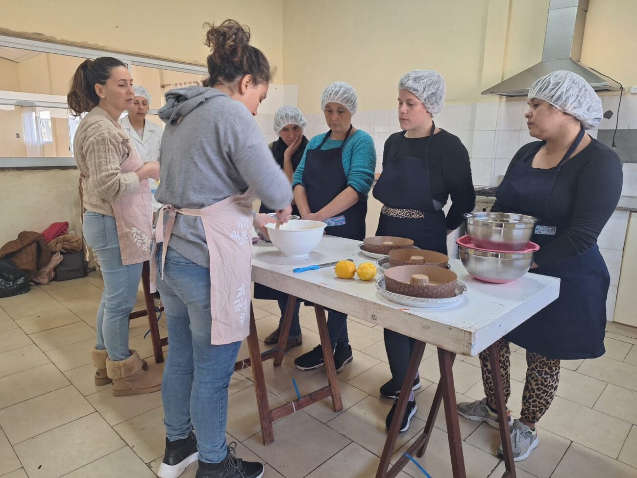 En este marco, se están desarrollando allí distintas capacitaciones, no solamente en lo que respecta a la manipulación de alimentos, sino también en capacitaciones específicas, como en el caso de pastelería, habiéndose dictado hoy una clase a cargo de las reposteras Mary Grazziolo y Carolina Bouzón.