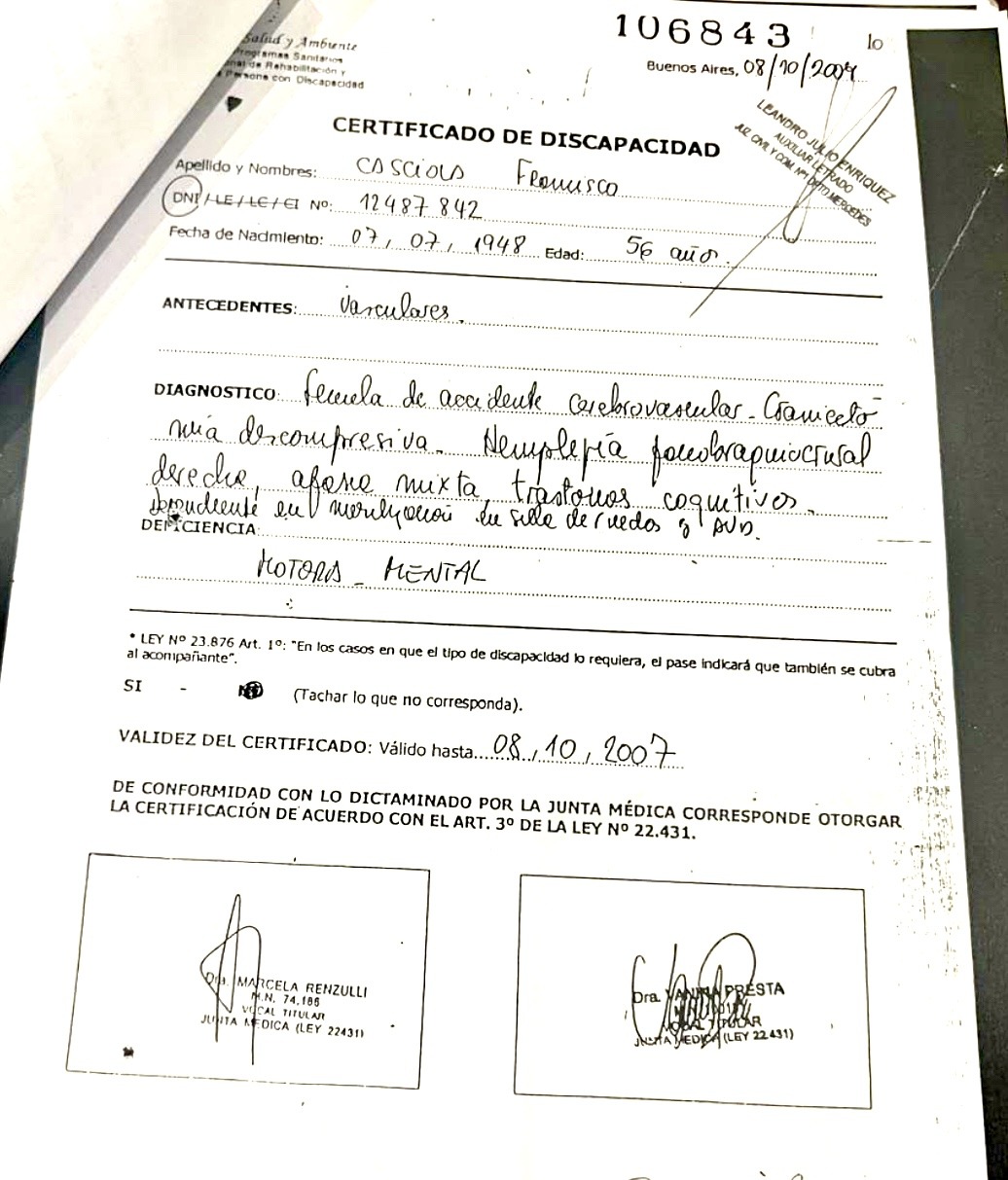 La situación se complica aún más cuando se considera que el certificado de discapacidad emitido por una Junta Médica Interdisciplinaria en octubre de 2004 ya había diagnosticado a Casciola con afasia mixta, condición que debía haber sido tomada en cuenta al momento de la firma del poder. Sin embargo, este informe, que claramente indicaba que Casciola no comprendía ni podía expresarse adecuadamente, fue desestimado por la jueza, lo que pone en evidencia una grave falta de rigor en la evaluación de la situación.