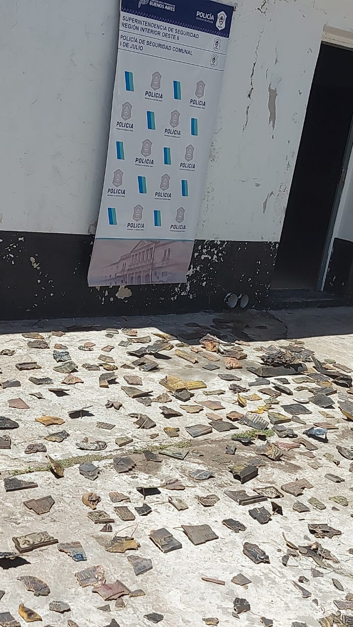 Parte policial: Ayer, en horas del mediodía, personal policial de la Estación de Policía de 9 de Julio con la colaboración de personal de la SUB DDI 9 de Julio, en calles Belgrano y Schweltzer, con la colaboración del Centro de Monitoreo de Cámaras de la Municipalidad de 9 de Julio,  a la interceptación de rodado marca Volswagen Gol de color negro conducido por masculino de 18 años quien se hallaba en compañía de otro sujeto de 19 años ambos con domicilio en planta urbana de esta ciudad, incautándose del interior del rodado varios fragmentos de bronce correspondientes a  Placas de Bronce del Cementerio local ( denunciadas como sustraídas por empleado del Cementerio el día 3 del corriente en sede policial), asimismo se incauta en el interior del rodado un pullover con escudo de la policía de la Provincia de Buenos Aires, herramientas varias y documentación del rodado el cual se encuentra a nombre de un personal policial femenino que trabaja en la Comisaria de Carlos Casares hermana del conductor del rodado, consecuencia de ello se procede a la aprehensión de los masculinos trasladándolos hasta el asiento de la Estación de Policía junto a los objetos incautados, estableciéndose además que estos sujetos participaron de robo de Placa de Bronce de la Escuela E.E.P nro 3 sito en Vedia 454 de este medio denuncia radicada por Directora del lugar en esta dependencia el día 3 del corriente, de Robo de Placa de Bronce de Escuela nro 1 sito en Yrigoyen 951 de este medio denuncia radicada por Vicedirectora con fecha 2 del corriente mes en curso y de Robo de Placa de Bronce del Parque San Martin denuncia radicada en esta dependencia el día 23 de Diciembre del año pasado. Continuando con las tareas investigativas, ayer en horas de la tarde personal policial de este elemento junto a personal de la SUB DDI Bragado procede a efectivizar allanamiento dispuesto por la fiscalía interviniente en domicilio de calle Pasaje Rio Colorado y Alberdi de este medio donde se procede a la aprehensión de un masculino de 21 años y al secuestro también de fragmentos de placas de Bronce con inscripciones memoriales (pertenecientes al cementerio). Se estableció además de ello en base a testimonios recolectados  que estos sujetos una vez consumado el ilícito  revendían el Bronce. Los masculinos se encuentran detenidos por el delito de Robos Reiterados y Encubrimiento agravado con ánimo de lucro en una dependencia perteneciente a la Superintendencia de Región Interior Oeste II a cargo del Comisario Mayor Jose Ismael Gil  a disposición de la UFI 2 de Mercedes. En relación al efectivo policial propietaria del rodado,  fiscalía interviniente hasta el momento no tomó temperamento legal al igual que la Auditoria General de Asuntos Internos La Plata. La investigación fue realizada por el  Dr. Horacio Capurro de la Ayudantía Fiscal Local, GTO  y personal  que recorre en los móviles de la Estación de Policía de 9 de Julio a cargo del Sub Comisario Bruno Daniel Sbrissa juntamente con personal de la SUB DDI 9 de Julio y la supervisión del Jefe de Policía Comunal de 9 de Julio a cargo del Comisario Inspector Gustavo Quemehuencho y Sub Secretario de Seguridad Sr Marcelo Hoese.