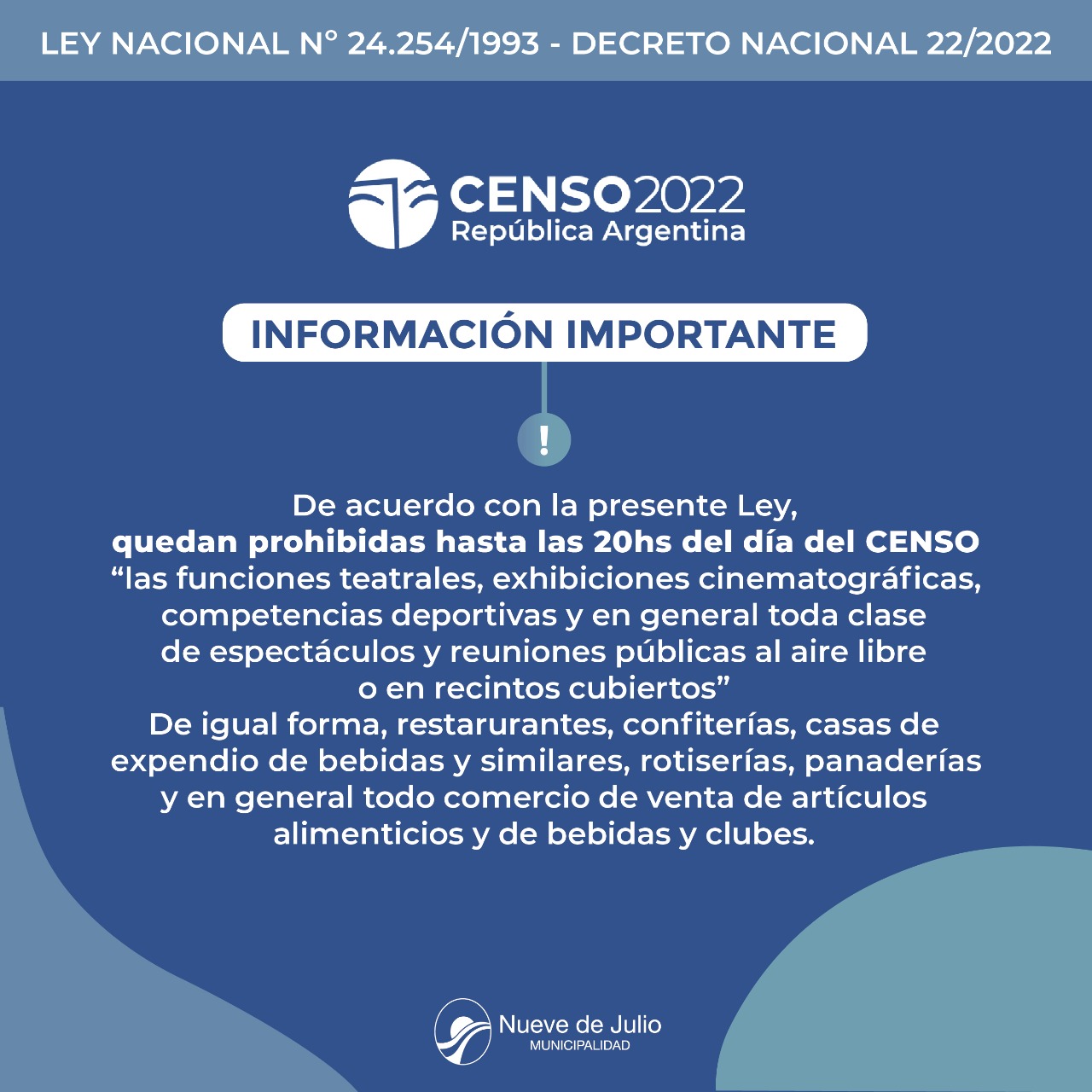 La Municipalidad de Nueve de Julio, a través de la Dirección de Relaciones con la Comunidad, informa que de acuerdo a la ley Nacional 24.254/1993, artículo 2, quedan prohibidas hasta las 20 hs. del día del censo (miércoles 18 de mayo), “la funciones teatrales, exhibiciones cinematográficas, competencias deportivas y en general toda clase de espectáculos y reuniones públicas al aire libre o en recintos cubiertos.