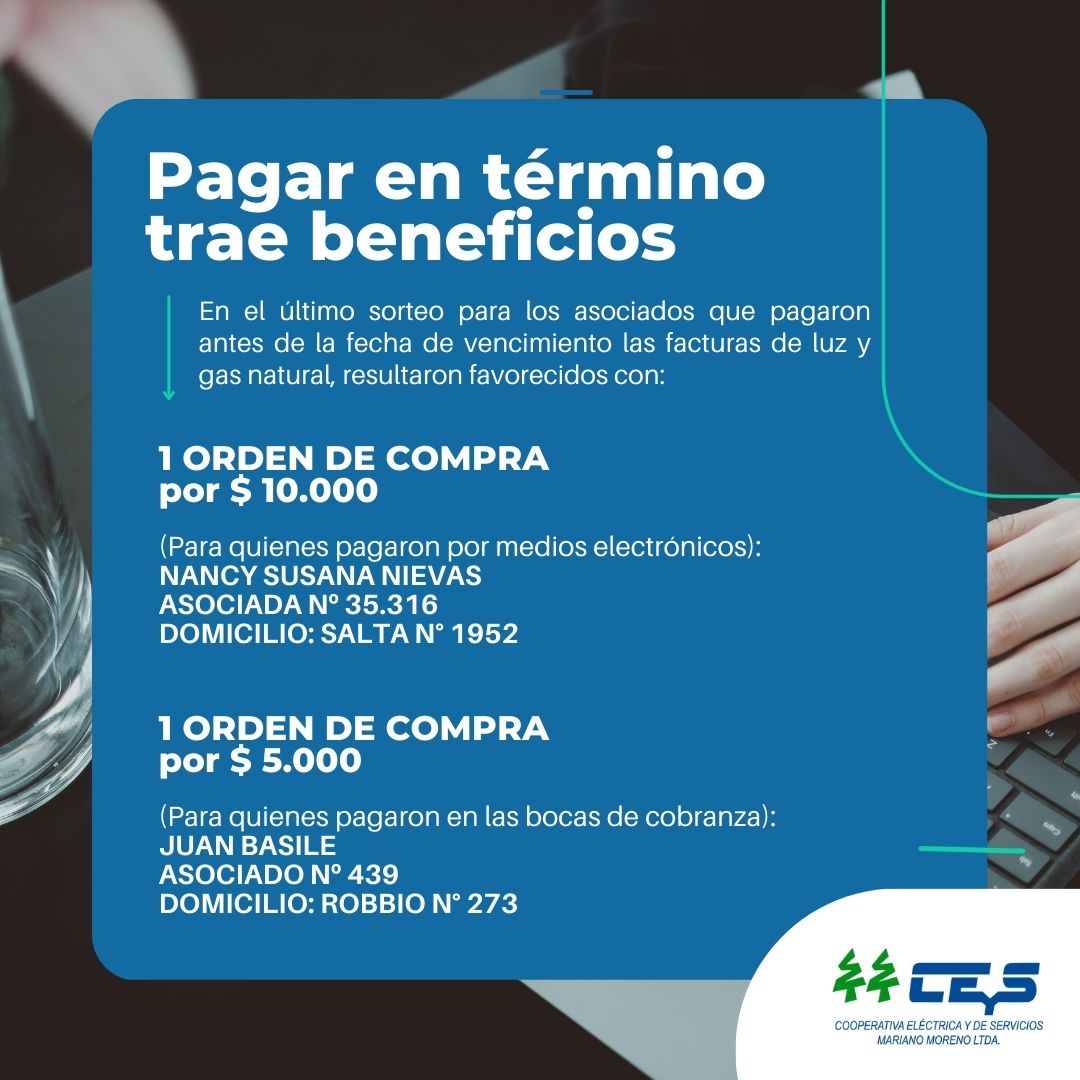 En el último sorteo para los asociados que pagaron antes de la fecha de vencimiento las facturas de luz y gas natural, resultaron favorecidos con: