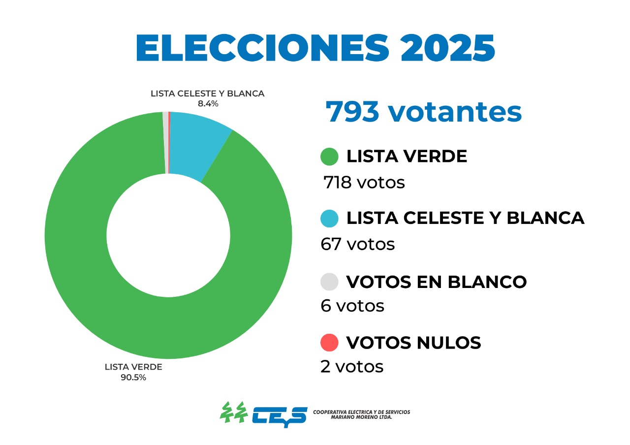 Como estaba previsto, finalmente este domingo se llevaron a cabo las elecciones de delegados en la Cooperativa Eléctrica y de Servicios Mariano Moreno. Con un total de 793 votantes, la Lista Verde obtuvo 718 votos, mientras que la Lista Celeste y Blanca tuvo 67, y ademas hubo 6 en blanco y 2 nulos.