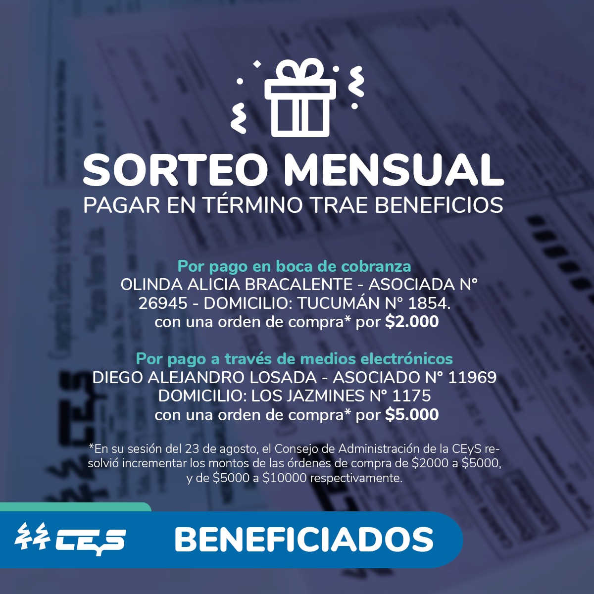 La CEyS llevó a cabo una nuevo sorteo de órdenes de compras correspondiente al mes de agosto, entre aquellos asociados que pagaron antes de la fecha de vencimiento las facturas de luz y gas natural.