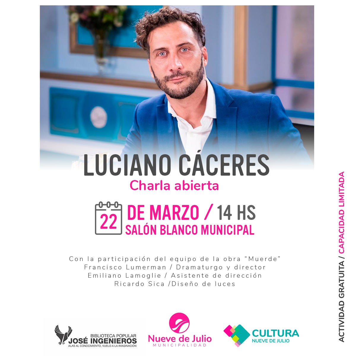 La Municipalidad de Nueve de Julio, a través de la dirección general de Cultura, y de manera conjunta con la Biblioteca Popular José Ingenieros, llevará adelante, el viernes 22 del corriente una charla abierta a la comunidad con el actor Luciano Cáceres y su equipo, para contar sobre su vida, su profesión y establecer un interesante diálogo con los integrantes del espectáculo que lo trae de visita a nuestra ciudad.