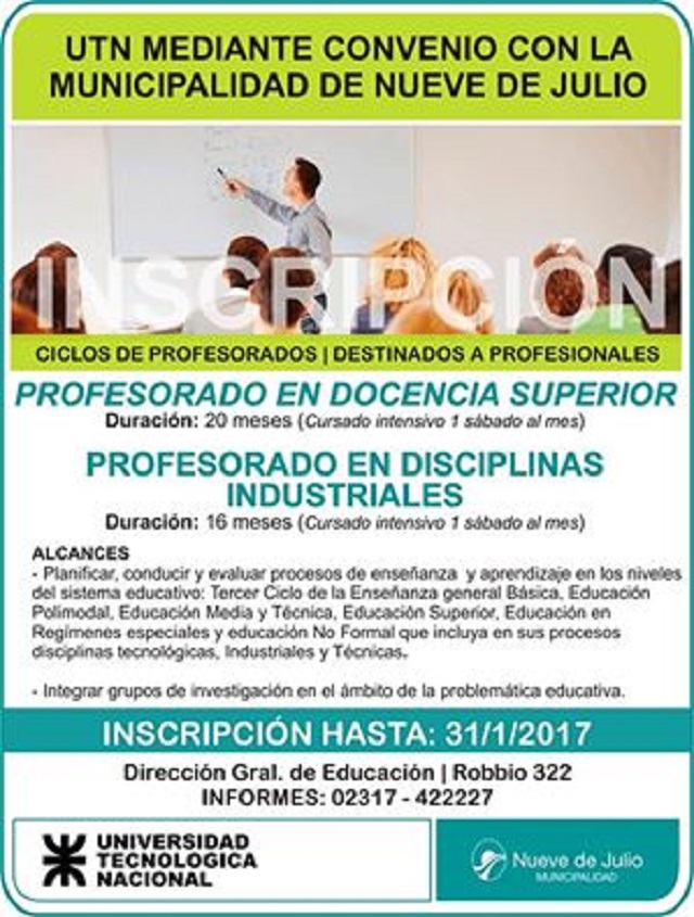 La Dirección de Educación, y en convenio con la Universidad Tecnológica Nacional de San Nicolás, recuerda que se encuentra abierta la inscripción a los siguientes Ciclos de Profesorados destinados a profesionales: