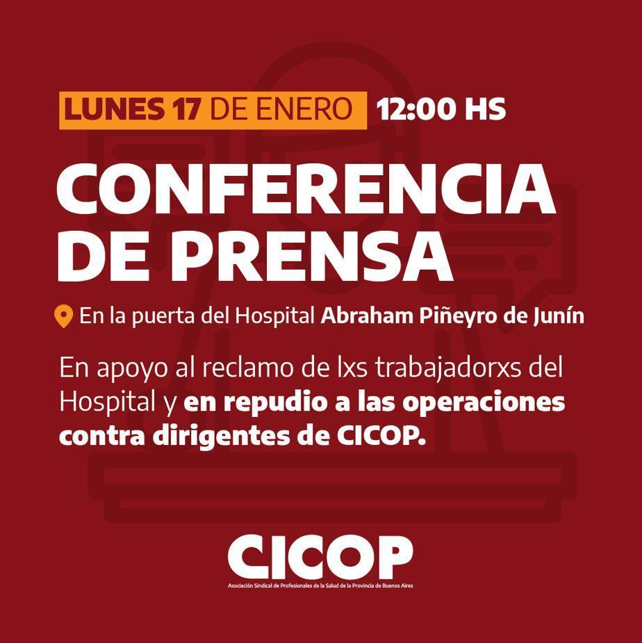 La Asociación Sindical de Profesionales de la Salud de la Provincia de Buenos Aires (CICOP) realizará una Conferencia de Prensa en la ciudad bonaerense de Junín hoy lunes 17 de enero a las 12 horas, en la puerta del Hospital Abraham Piñeyro.