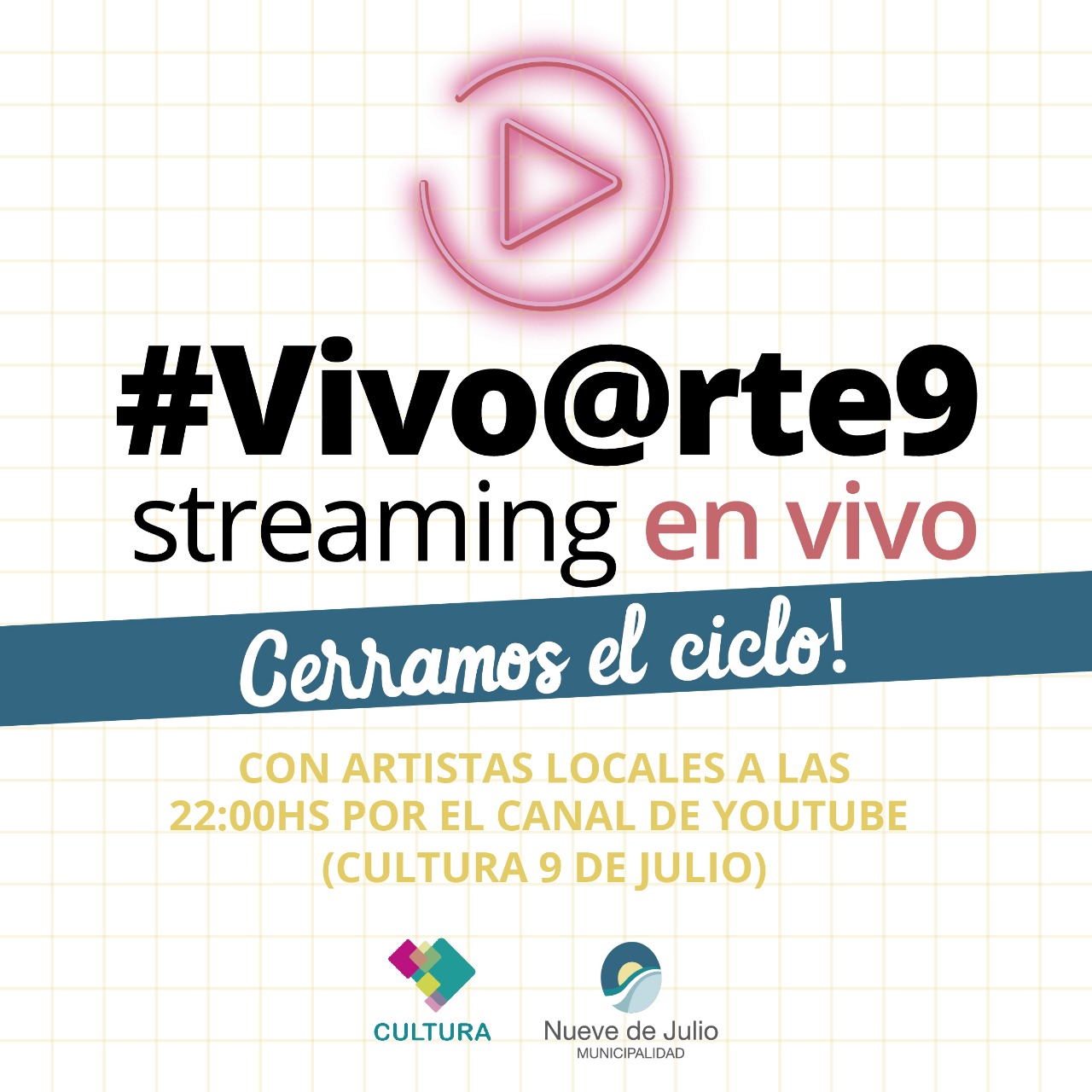 Este sábado 19, a las 22 hs., por el canal de Youtube “Cultura 9 de Julio”, se cerrará el ciclo denominado “Vivo@rte9”, que entregó a artistas locales la posibilidad de compartir sus producciones durante la pandemia, con las presentaciones de Daniel Cascallar, Trío “Arrebatao”, “Chaco” Castillo, Waldo Castillo, Yamil Castillo, Luciano Amaya y Néstor Celiz, quienes completarán una excelente oferta musical para disfrutar en familia.
