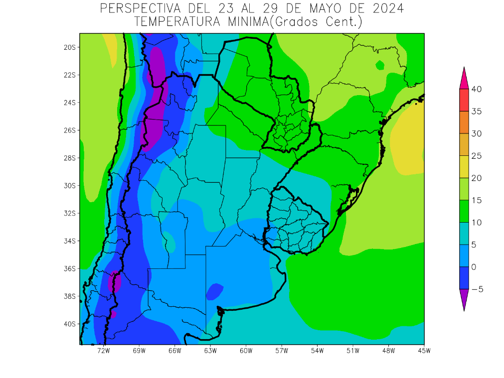 Los vientos polaresque acompañarán el paso del frente producirán temperaturas mínimas bajo lo normal en la mayor parte del área agrícola, con heladas generales en las zonas serranas del oeste, y heladas localizadas en el sur del área agrícola.